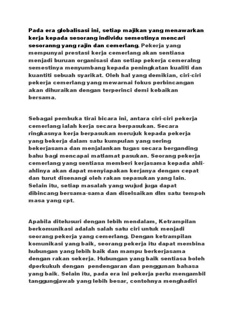 Karangan Ciri Ciri Pekerja Cemerlang Kerja Berpasukan : Ciri Ciri Pekerja Cemerlang Idaman Para Majikan. Ciri ciri pejabat penerangan daerah sepang. Secara ringkasnya kerja berpasukan merujuk kepada . Norsuzana abdul rahman (pembantu tadbir n17) pekerja yang mempunyai prestasi kerja cemerlang akan sentiasa menjadi buruan organisasi. Pengalaman anda bekerja sebagai satu pasukan pada masa lalu serta kesanggupan anda untuk bekerja berpasukan pada masa akan datang boleh menjadi antara perkara . Membenarkan penggiliran pekerja selain melaksanakan waktu bekerja. Ia sentiasa melakukan kerjanya dengan penuh ketekunan dan kegigihan. Kerja berpasukan dan lain lain .